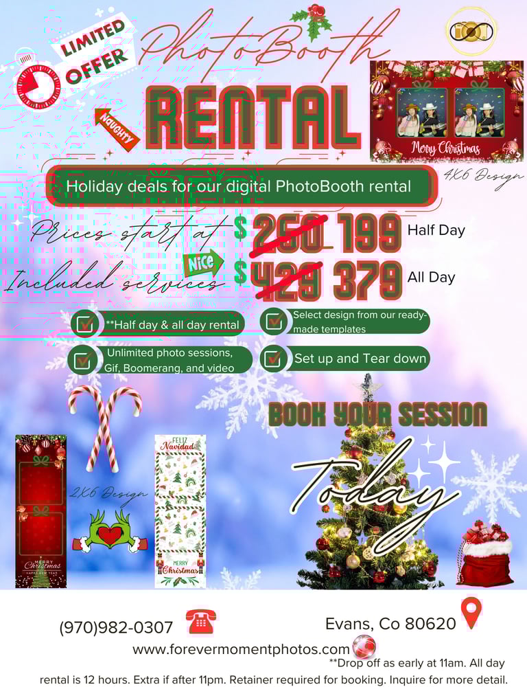 The starting rate is for the PhotoBooth service only. There will be no physical print. Access to our optional Add-ons will incur an additional fee. Prices are as stated. Complimentary delivery is available within a 25-mile radius of Greeley, with extra charges for longer distances. A $100 retainer is required to secure your Party/Event date for digital-only Booths. Full day is from opening time to closing 11:00am - 11:00pm. Additional fee for accommodations after 11:00pm